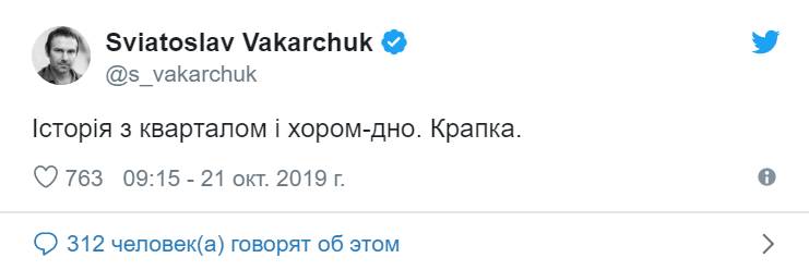 Об этом говорится в твиттер-микроблоге Вакарчука в понедельник, 21 октября. "История с кварталом и хором - дно. Точка", - говорится в опубликованном сообщении.