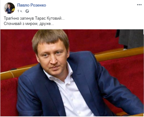 "Трагически погиб Тарас Кутовой. Покойся с миром, друг", - написал экс-вице-премьер Павел Розенко.