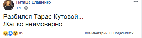 "Разбился Тарас Кутовой... Жалко неимоверно" - сообщила телеведущая Наталья Влащенко.