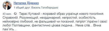 "Тарас Кутовой - яркий образ украинца нового поколения. Настоящий. Умный, неординарный, сложный, личность, невероятно глубокий, а не фальшивый или показной, патриот Украины и своей любимой Полтавщины, фантастически интересный человек... Нет слов ... Вечная память" - написала синоптик Наталья Диденко.