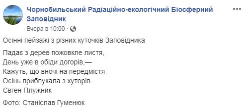 В Чернобыльской зоне отчуждения показали умиротворяющие осенние пейзажи. Фотографиями поделились сотрудники Чернобыльского радиационно-экологичного биосферного заповедника на своей странице в Facebook.