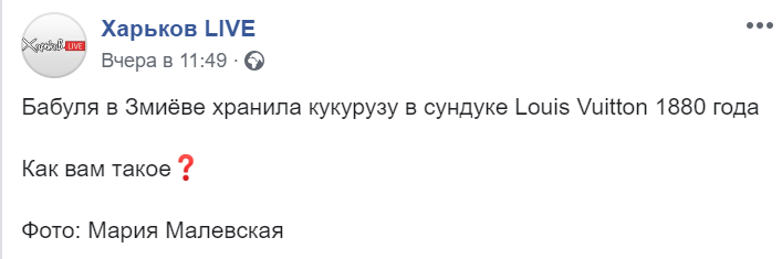 В подсобке у пенсионерки из Змиева долгие годы стоял саквояж Louis Vuitton выпуска 1880 года. Женщина использовала его для хранения кукурузы. Об этой истории на странице "Харьков LiVE" рассказала пользователь Марина Малевская.
