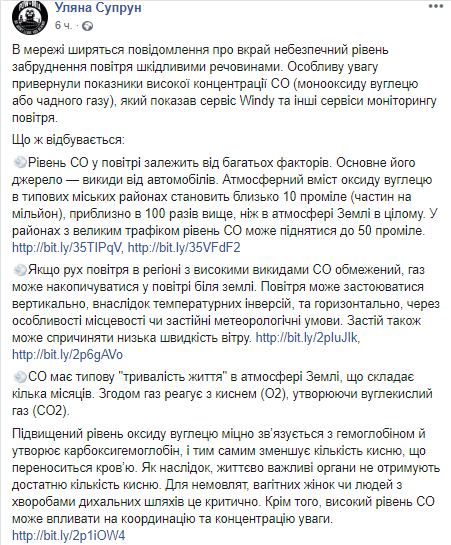 Также Ульяна Супрун напомнила, что в Украине и Европе нет нормального уровня СО в воздухе. Он везде завышен, особенно в городах.