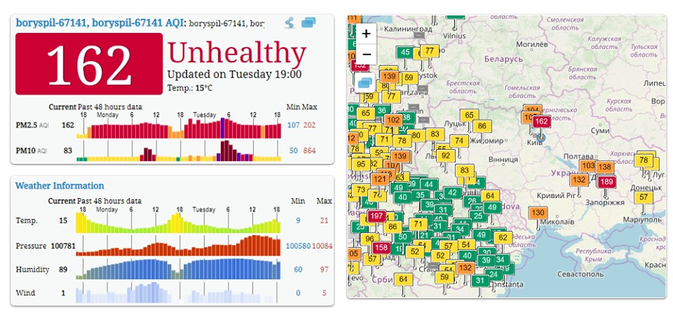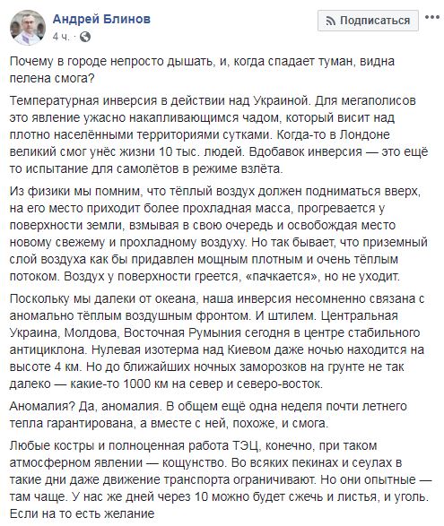 "Температурная инверсия в действии над Украиной. Для мегаполисов это явление ужасно накапливающимся чадом, который висит над плотно населенными территориями сутками. Когда-то в Лондоне великий смог унес жизни 10 тысяч людей. Вдобавок инверсия - это еще то испытание для самолетов в режиме взлета", - сообщил Блинов.