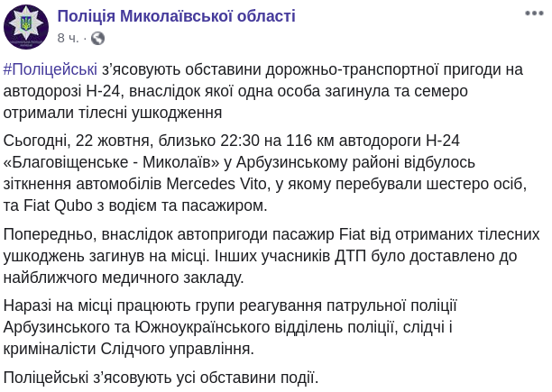 В результате столкновения автомобилей на трассе "Благовещенское - Николаев" один человек погиб и семеро получили ранения. Об этом сообщает полиция Николаевской области в соцсети.