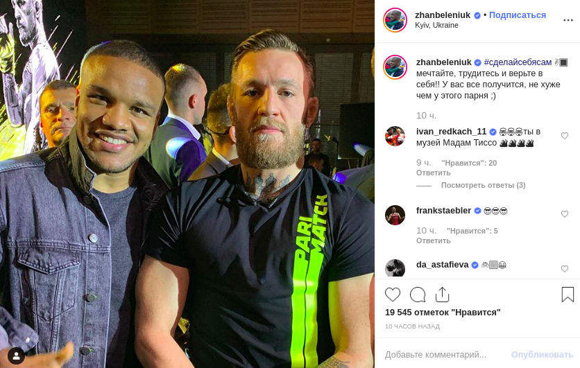 С Макгрегором в Киеве сфотографировался чемпион мира по греко-римской борьбе, народный депутат Жан Беленюк. Общее фото он разместил в Instagram.