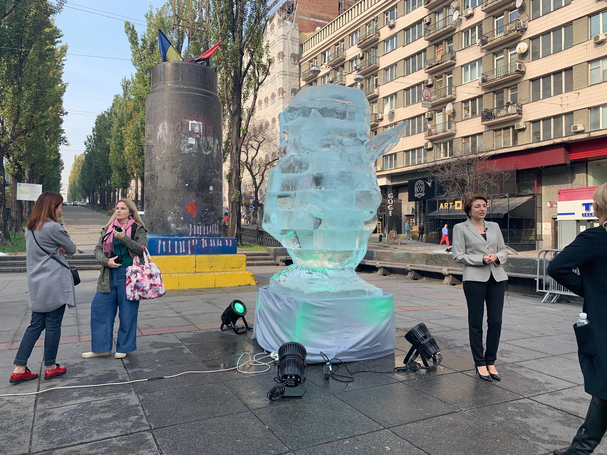 Ледяную же скульптуру установили на бульваре Тараса Шевченко возле разрушенного памятника Ленину, на месте, где стояла известная "синяя рука".