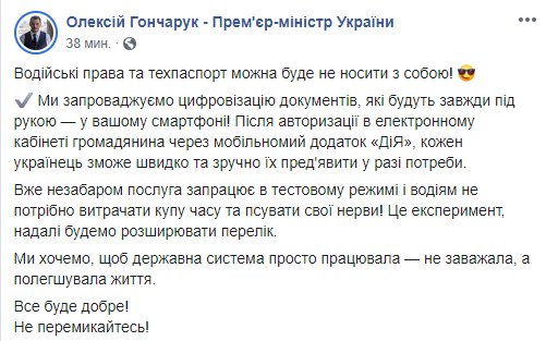 Гончарук пообещал, что скоро водители смогут предъявлять права и техпаспорт в смартфоне