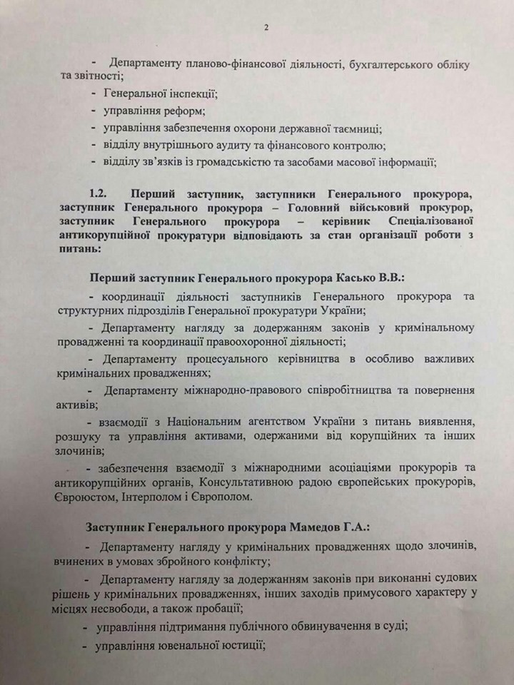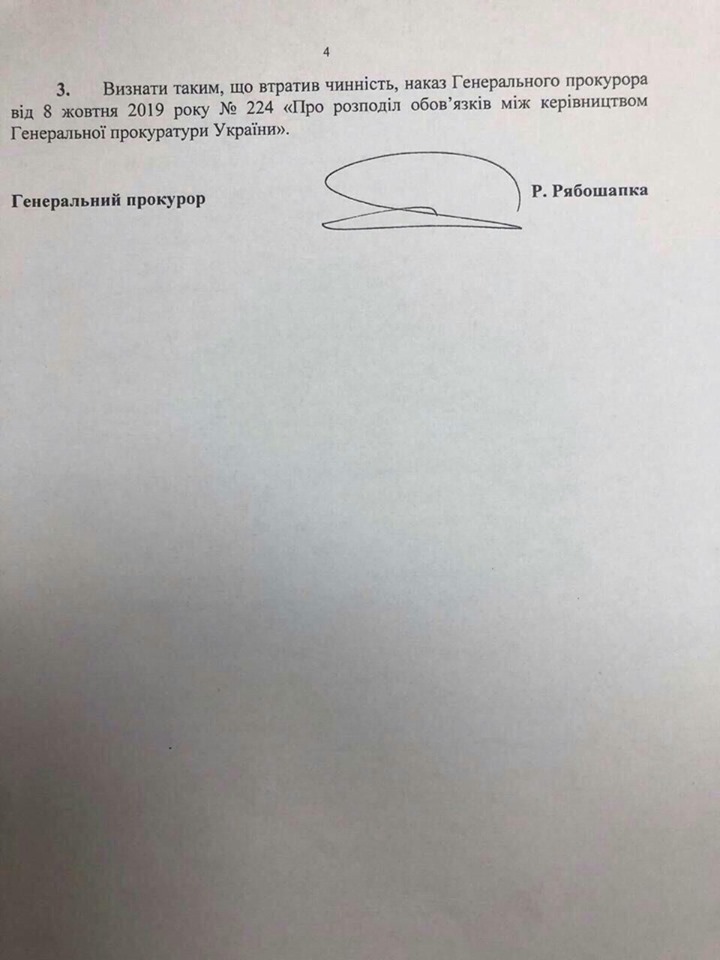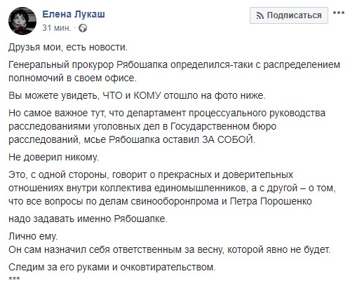"Генеральный прокурор Рябошапка определился-таки с распределением полномочий в своем офисе. Но самое важное тут, что департамент процессуального руководства расследованиями уголовных дел в Государственном бюро расследований, мсье Рябошапка оставил за собой. Не доверил никому", написала Лукаш.