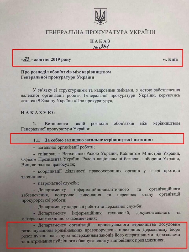 Генеральный прокурор Украины Руслан Рябошапка распределил полномочия в ведомстве, отставив за собой департамент процессуального руководства расследованиями уголовных дел в Государственном бюро расследований.