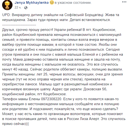 Кража произошла в среду утром, 23 октября, когда под предлогом обмена детскими вещами она встретилась у почтового отделения в Коцюбинском с матерью-одиночкой Женей Михайленко. Женщины разобщались и молодая мама попросила присмотреть за мальчиком новую знакомую, пока сама отлучилась на почту. Дождавшись этого подходящего момента, злоумышленница забрала трехмесячного малыша, вызвала такси и увезла ребенка.