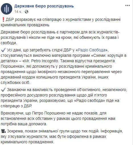 "Учитывая важность проведения объективного, независимого, профессионального досудебного расследования относительно действий пятого президента Украины, рассчитываем, что "Радио Свобода" пойдет на сотрудничество с ГБР. Учитывая, что Петр Порошенко не предоставляет показаний, для установления всех обстоятельств в рамках этого производства нам нужна ваша помощь", - заявили в ГБР.