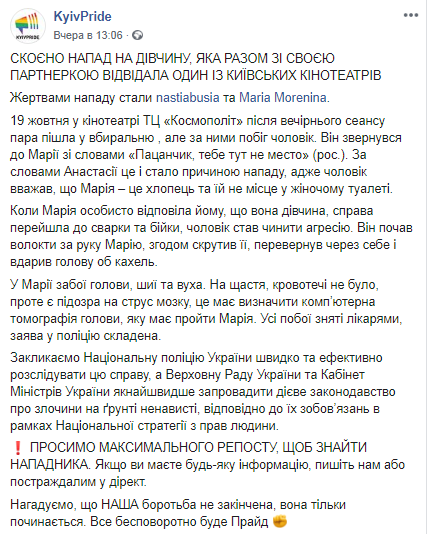 В субботу, 19 октября в кинотеатре ТЦ "Космополит" в Киеве мужчина напал на пару лесбиянок, потому что перепутал одну из них с парнем. Об этом в Facebook сообщает ЛГБТ-сообщество KyivPride.