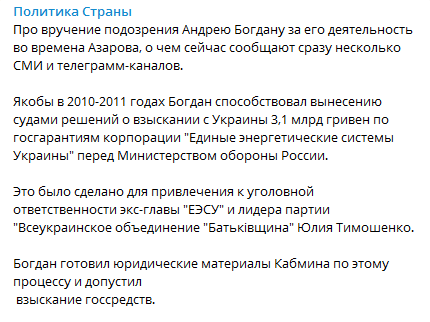Напомним, по данным СМИ, 21 октября в Управлении спецрасследований обсуждался вопрос о наличии оснований для сообщения о подозрении Богдану. Его подозревают в нарушении закона во время работы в Кабмине Николая Азарова. По мнению следствия, действующий глава Офиса президента способствовал вынесению судами решений о незаконном взыскании с Украины 3,1 млрд гривен по госгарантиям корпорации "Единые энергетические системы Украины" перед Министерством обороны России.