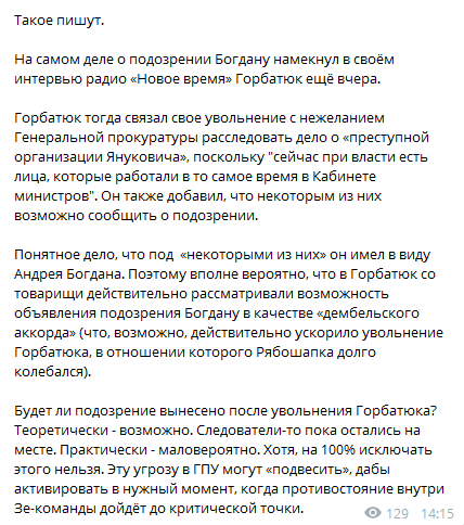 Теоретически возможно, что подозрение будет вынесено после увольнения Горбатюка, так как следователи пока остались на месте. Но практически это маловероятно. Эту угрозу в ГПУ могут "подвесить" и активировать в нужный момент, когда противостояние внутри Зе-команды дойдёт до критической точки.
