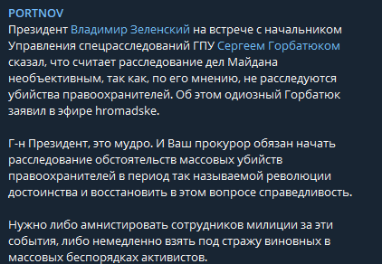 В свою очередь известный юрист Андрей Портнов поддержал позицию президента на своей странице в Телеграме. По его словам генпрокурор должен начат расследование убийств правоохранителей на Майдане и призвал взять под стражу активистов, которые виновны в массовых беспорядках.