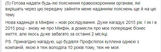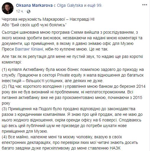 "Покупка "Актив-банка" была моей бизнес-ошибкой задолго до прихода на службу. Работая в секторе Private equity я имела отношение ко многим инвестициям - большинству успешных, но некоторых не слишком. Во время короткого владения и управления мной банком в марте 2014 он не был признан ни проблемным, ни неплатежеспособным. Все вопросы по "Актив-банку" уже не раз прокомментированы мной начиная с 2015 года. Помещение на Подоле было продано в соответствии с законодательством вместе с юридическими компаниями. Я знаю об этой продаже, но не имею к ней никакого отношения, кроме аренды офиса на 6-м этаже. Надеюсь, что весь этот публичный шум не приведет к необходимости искать новое помещение для Музея", - утверждает она.