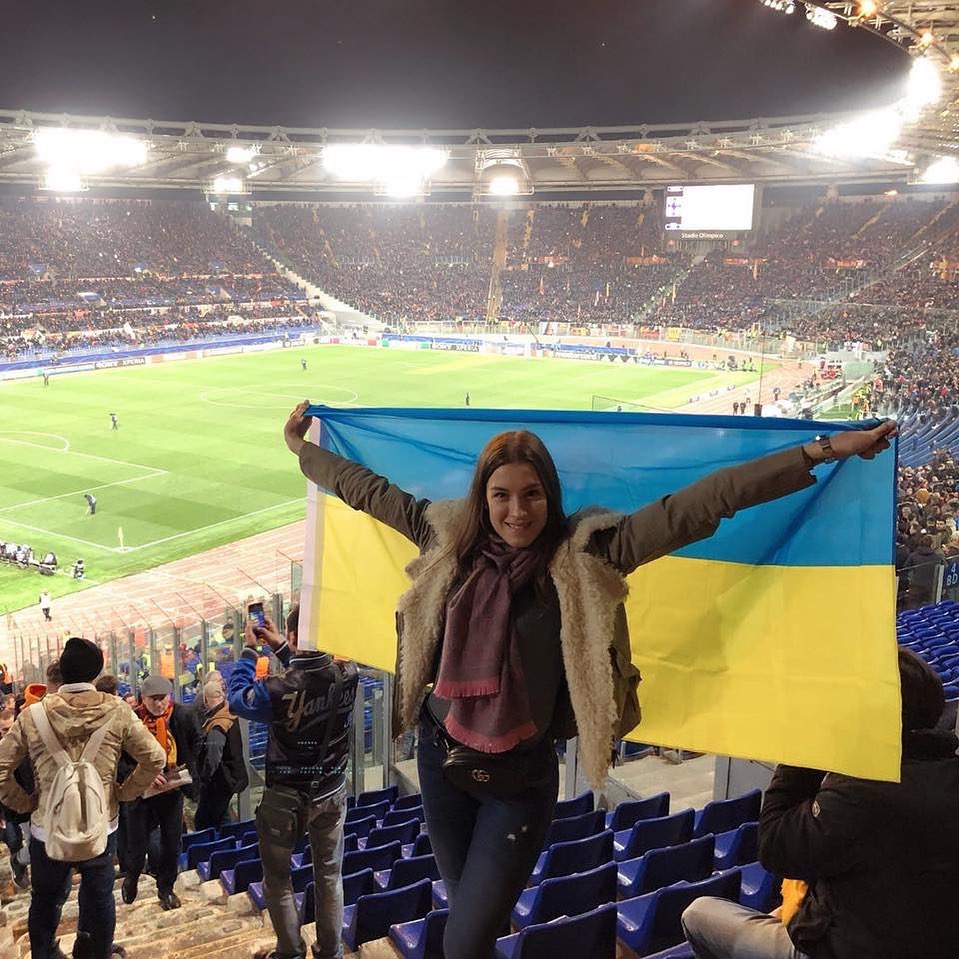 Некоторые фотографии самой красивой украинки говорят о ее увлечении футболом. "Победу Украине", - подписала снимок с украинским флагом на трибунах болельщица Анастасия.