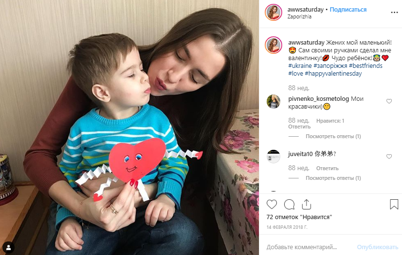 В альбоме Анастасии Субботы есть фотографии с детьми. Однако степень родства с мальчиком на фото не указана. "Жених мой маленький! Сам своими ручками сделал мне валентинку! Чудо ребенок", - подписала девушка снимок в День всех Влюбленных год назад.