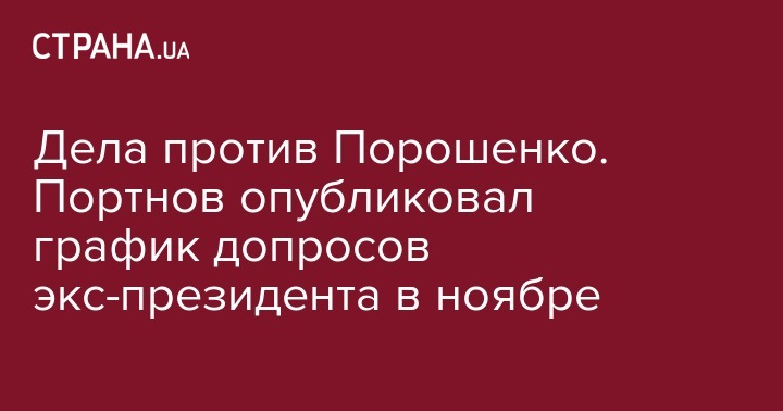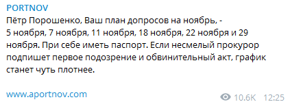 По его данным, допросы Порошенко запланированы на 5, 7, 11, 18, 22 и 29 ноября. "Если несмелый прокурор подпишет первое подозрение и обвинительный акт, график станет чуть плотнее", - написал Андрей Портнов.