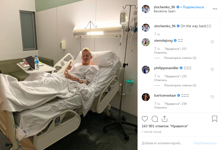 Сам 22-летний хавбек национальной футбольной сборной Украины Александр Зинченко опубликовал в Instagram фото, на котором он лежит в больничной палате одной из клиник в Барселоне. "На пути к возвращению", - написал он.