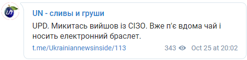 "Микитась вышел из СИЗО. Уже пьет дома чай и носит электронный браслет", - говорится в нем.
