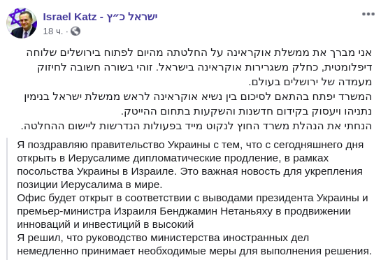"Я поздравляю правительство Украины с открытием в Иерусалиме дипломатического продолжения в рамках Посольства Украины в Израиле. Это важная новость для укрепления позиции Иерусалима в мире", - подчеркнул Кац.