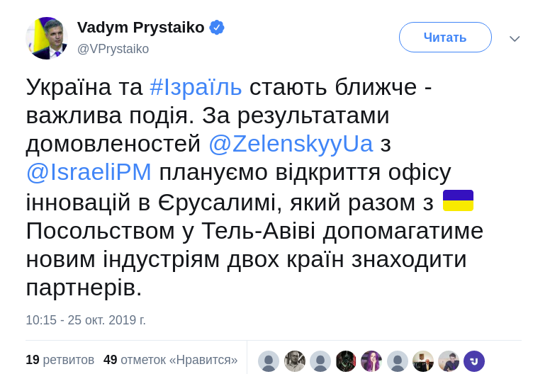 "Украина и Израиль становятся ближе - важное событие. По результатам договоренностей Владимира Зеленского с премьер-министром Израиля планируем открытие офиса инноваций в Иерусалиме, который вместе с Посольством в Тель-Авиве будет помогать новым индустриям двух стран находить партнеров", - написал Пристайко.