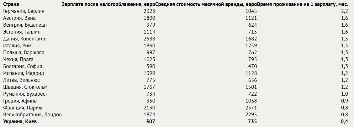 Самая высокая чистая зарплата в Дании - 2588 евро. Следующие в списке Германия (2323 евро) и Франция (2130 евро). Самая низкая зарплата в Украине - 307 евро, на втором месте с конца идет Болгарии (590 евро).
