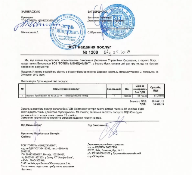Известно, что ГУД заплатило 101,6 тыс. гривен за бронь в отеле с 18 на 19 августа президентского номера.