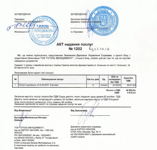 Таким образом, один номер для членов делегации премьера Израиля обошелся Госуправлению делами в 5 тыс. гривен в сутки.
