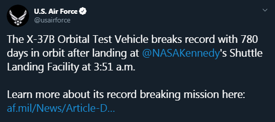 "Космический самолет проводил эксперименты на орбите в течение 780 дней, побив недавно свой собственный рекорд, проведя на орбите более двух лет. На сегодняшний день общее количество дней, проведенных там в рамках данной программы, составляет 2865 дней", - отделались военные общими фразами.
