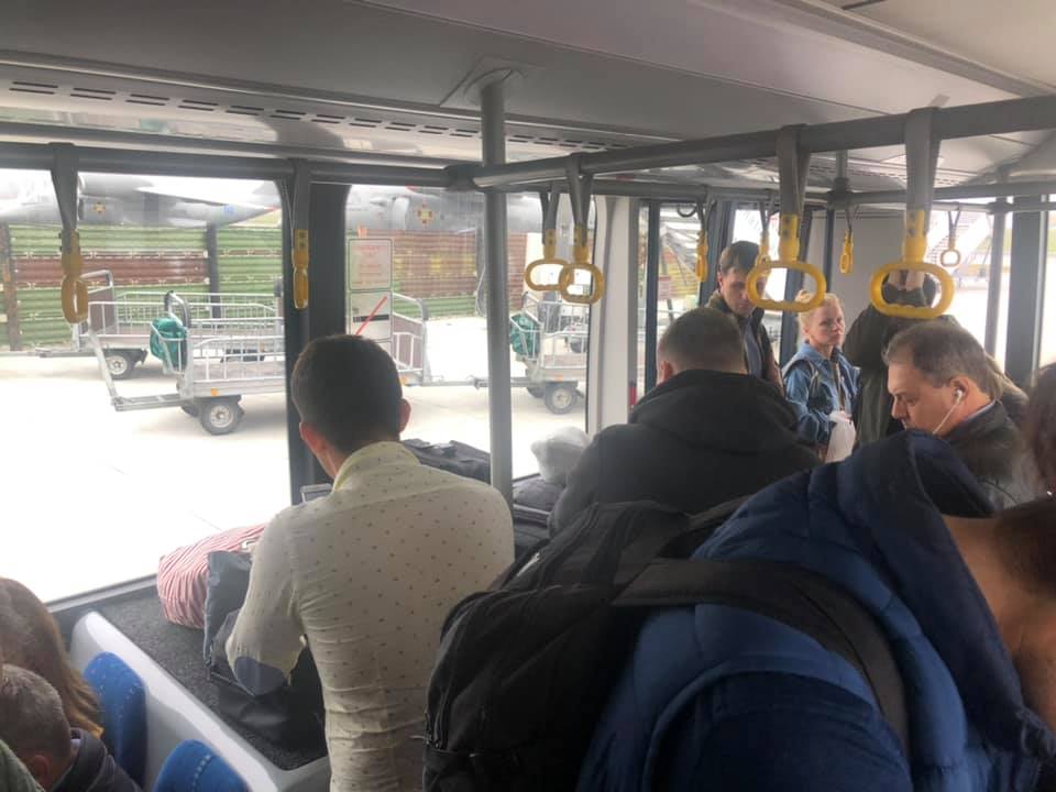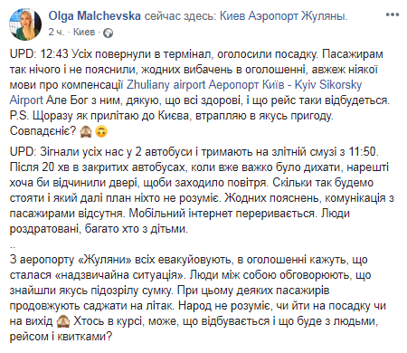 Об эвакуации пассажиров в Facebook сообщила журналистка BBC Ольга Мальчевская. По ее словам, людей посадили в автобусы, находящиеся на взлетной полосе, но никто не объяснил, что происходит, ссылались лишь на "чрезвычайную ситуацию". По состоянию на 12:43 всех вернули в терминал, огласили посадку на рейсы. Объяснений или извинений в объявлении от администрации аэропорта не содержалось.
