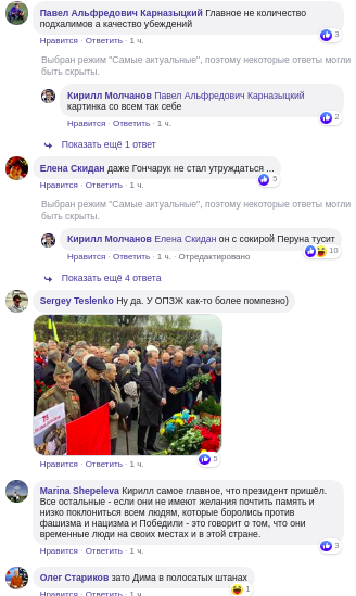 Были и те, кто поддержал президента: "Самое главное, что президент пришёл. Все остальные - если они не имеют желания почтить память и низко поклониться всем людям, которые боролись против фашизма и нацизма и Победили - это говорит о том, что они временные люди на своих местах и в этой стране".