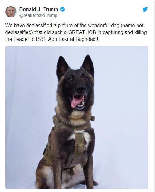"Мы сняли гриф секретности с изображения великолепного пса (имя остается засекреченным), который сделал такую хорошую работу в операции по захвату и ликвидации лидера ИГИЛ Абу Бакра аль-Багдади!", - написал американский президент.