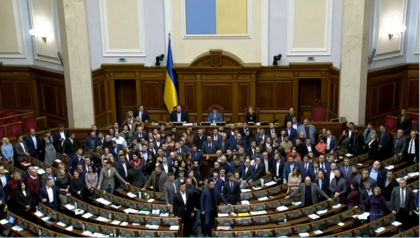 Депутаты фракции "Слуги народа" вышли к трибуне Верховной Рады, выражая возмущение словами представительницы "Европейской солидарности" Софии Федыны об общении президента Украины Владимира Зеленского с националистами в Золотом.