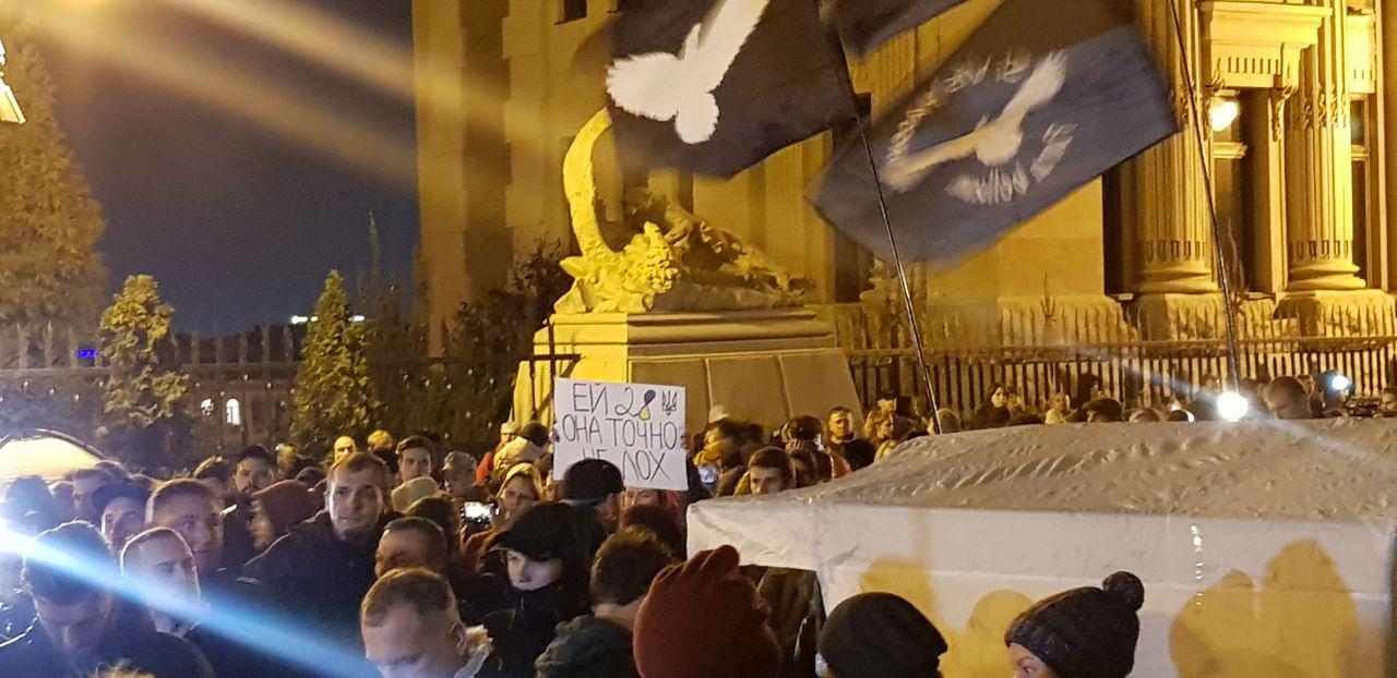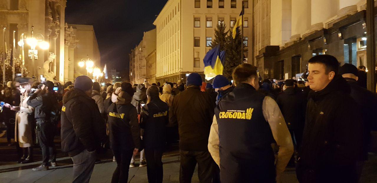 19:00 Собравшиеся выкрикивают "Нет капитуляции" и "Слава Украине". Среди них "свободовцы", представители Нацкорпуса.