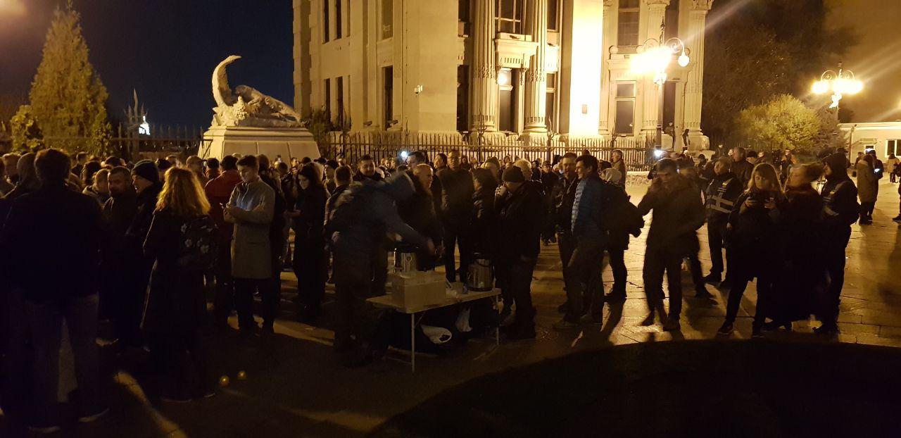 19:20 Под ОП собрались порядка 300 человек, все скандируют "Нет капитуляции". Участники митинга держат различные плакаты антипрезидентской риторики. Под ОП также установили палатки. Охрану порядка обеспечивает полиция диалога, их не более 30 человек.