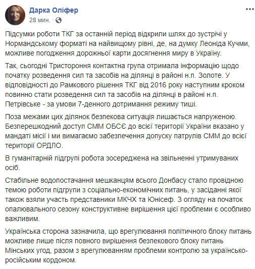 "Итоги работы ТКГ за последний период открыли путь к встрече в нормандском формате на высшем уровне, где, по мнению Леонида Кучмы, возможно согласование дорожной карты достижения мира в Украине", - написала Олифер по итогам заседания ТКГ в Минске.