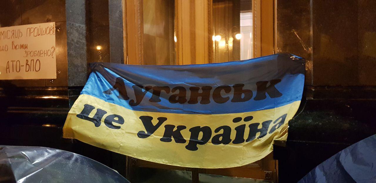 По словам спикеров митинга, отвод войск в Золотом - это подыгрывание Путину и проигрыш в войне. Участники митинга держат в руках плакаты с антипрезидентской риторикой. Кроме того, под ОП установили палатки. Охрану порядка обеспечивает полиция диалога, их не более 30 человек.