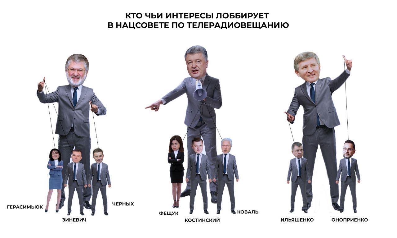 Коломойскому принадлежит телеканал 1+1, Порошенко - "Прямой" и 5-й канал (прямые конкуренты в информационной нише NewsOne и 112), Ахметову - телеканал "Украина" (также, по слухам, он собирается запускать и свой новостной канал).