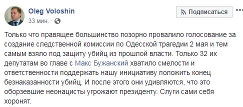 Народный депутат от фракции "Оппозиционная платформа - За жизнь" Олег Волошин возмутился таким решением парламента. "Только что правящее большинство позорно провалило голосование за создание следственной комиссии по Одесской трагедии 2 мая и тем самым взяло под защиту убийц из прошлой власти. Только 32 их депутатам во главе с Макс Бужанский хватило смелости и ответственности поддержать нашу инициативу положить конец безнаказанности убийц. И после этого они удивляются, что это оборзевшие неонацисты угрожают президенту. Слуги сами себя хоронят", - написал он в Facebook.