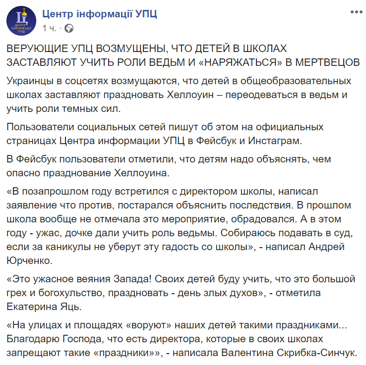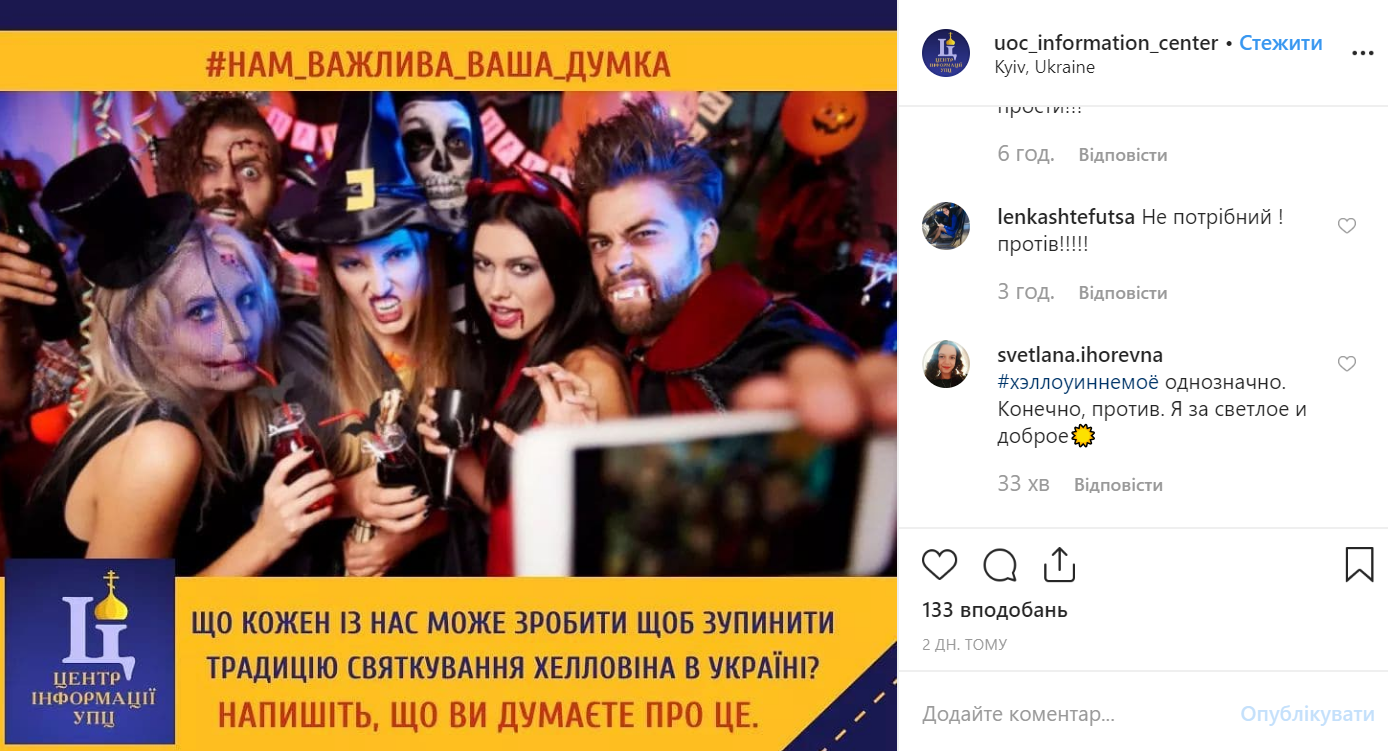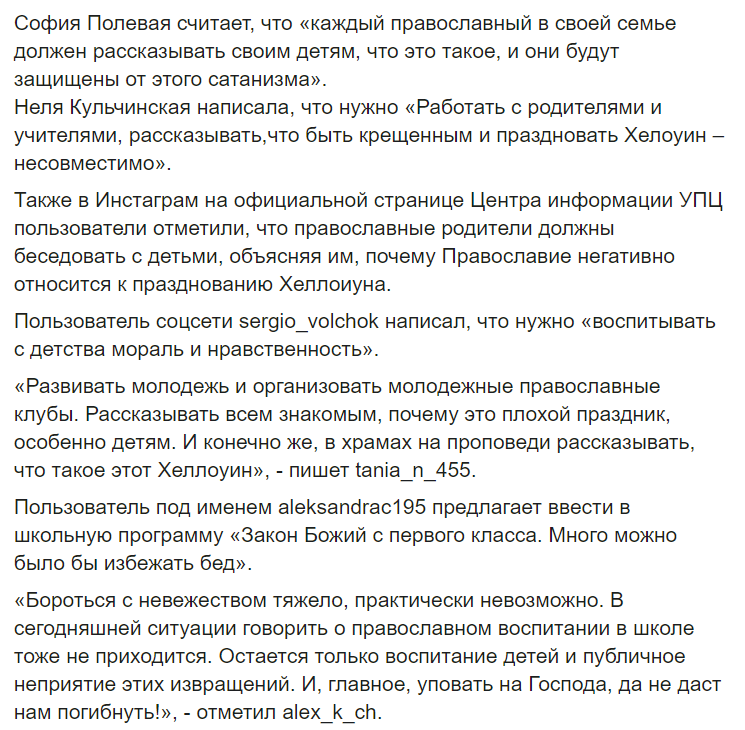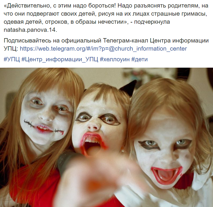 Также в Инстаграм на официальной странице Центра информации Украинской православной церкви (УПЦ) пользователи отметили, что православные родители должны беседовать с детьми, объясняя им, почему Православие негативно относится к празднованию Хеллоиуна.