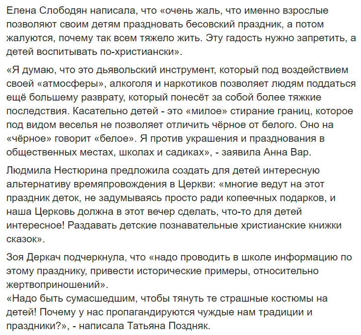 Елена Слободян отметила, что "очень жаль, что именно взрослые позволяют своим детям праздновать бесовский праздник, а потом жалуются, почему так всем тяжело жить. Эту гадость нужно запретить, а детей воспитывать по-христиански".