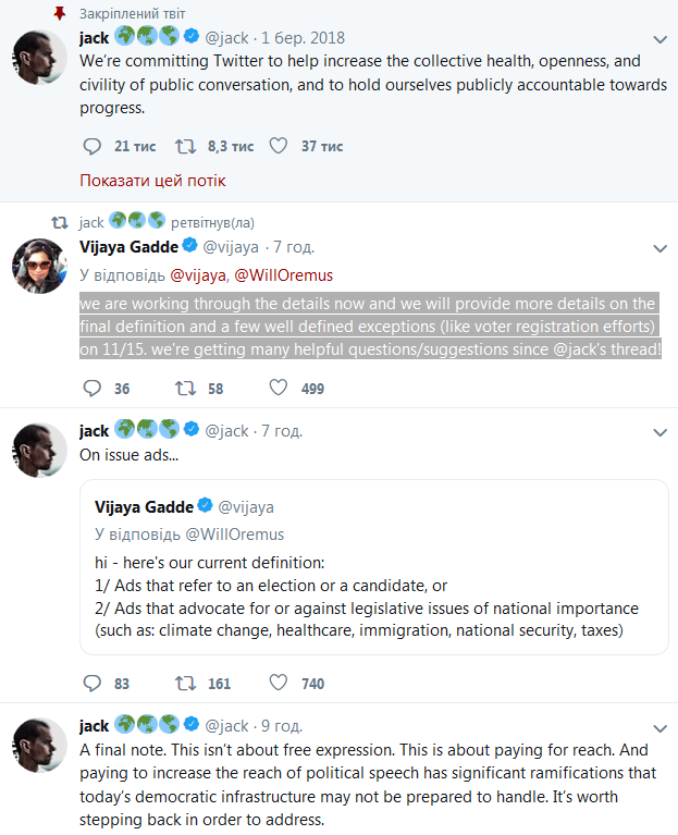 "Мы приняли решение прекратить всю политическую рекламу в Twitter по всему миру. Мы считаем, что охват политических заявлений должен быть заработан, а не куплен... Мы стремимся к тому, чтобы Twitter способствовал укреплению коллективного здоровья, открытости и вежливости публичных разговоров, а также чтобы мы были публично подотчетны прогрессу.
