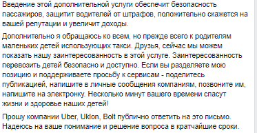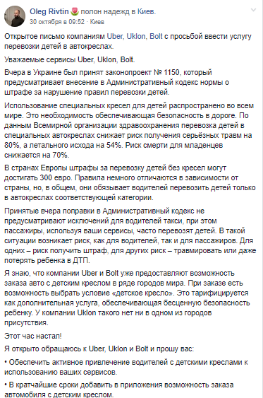 А киевлянин Олег Ривтин обнародовал открытое письмо к компаниям Uber, Uklon, Bolt с просьбой ввести услугу перевозки детей в автокреслах. Он попросил обеспечить активное привлечение водителей с детскими креслами к использованию сервисов, а также добавить в приложения возможность заказа автомобиля с детским креслом.