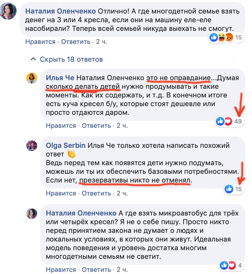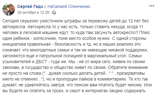 "Сегодня серьезно ужесточили штрафы за перевозку детей до 12 лет без автокресла. Автокресла то у нас есть, только ставить некуда, когда 11 человек в легковой машине едут, то куда там засунуть автокресло? Плюс один ребенок - колясочник, тоже место особое нужно. С одной стороны инициатива правильная - безопасность и тд, но в наших реалиях это означает, что многодетные семьи и так не имеющие никакой поддержки, загоняются еще и патрульной полицией в маргинальный угол. Семьи усыновителей и ДБСТ - туда же. Мы - не от мира сего, живем по своим законам, а государство и общество живет по своим. Обратите внимание не просто на слова ("...думая сколько делать детей..." "...презервативы никто не отменял..."), но и пропорции лайков в комментариях. Те кто так думает, не удивляйтесь завтра, что пенсии вам платить будет некому. Или вы будете их платить за троих, и сирот в интернатах заодно содержать" - отреагировал многодетный отец Сергей Гедз.