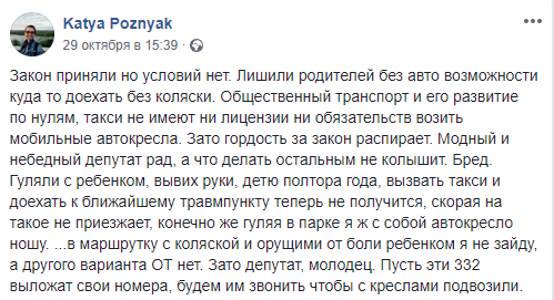 "Закон приняли но условий нет. Лишили родителей без авто возможности куда то доехать без коляски. Общественный транспорт и его развитие по нулям, такси не имеют ни лицензии ни обязательств возить мобильные автокресла. Зато гордость за закон распирает. Модный и небедный депутат рад, а что делать остальным не колышет. Бред.