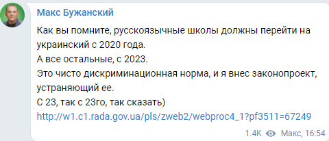 Депутат от партии "Слуга народа" Максим Бужанский заявил, что внес в Раду законопроект (№2362), который должен отменить дискриминационную, по его мнению, норму закона о языке, по которой все русскоязычные школы перейдут на украинский язык обучения в сентябре 2020 года.
