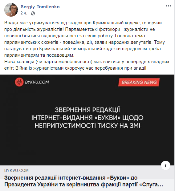 Председатель Национального союза журналистов Украины Сергей Томиленко призвал украинские власти не запугивать журналистов, которые работают в парламенте, Уголовным кодексом. Об этом он написал на своей странице в Facebook.